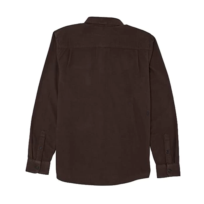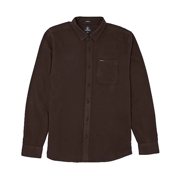 Volcom Caden Solid regular fit long sleeve shirt in dark brown for men. Branding includes a Volcom embroidered logo and Volcom woven label. Made from 100% cotton.