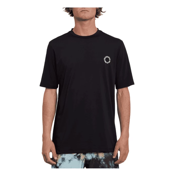 Volcom Faulter short sleeve surf tee in black features a boardshort connector loop and chest print as well as rear print and UPF 50+. Branding includes a Volcom logo chest print. Made from 12% elastane and 88% polyester.