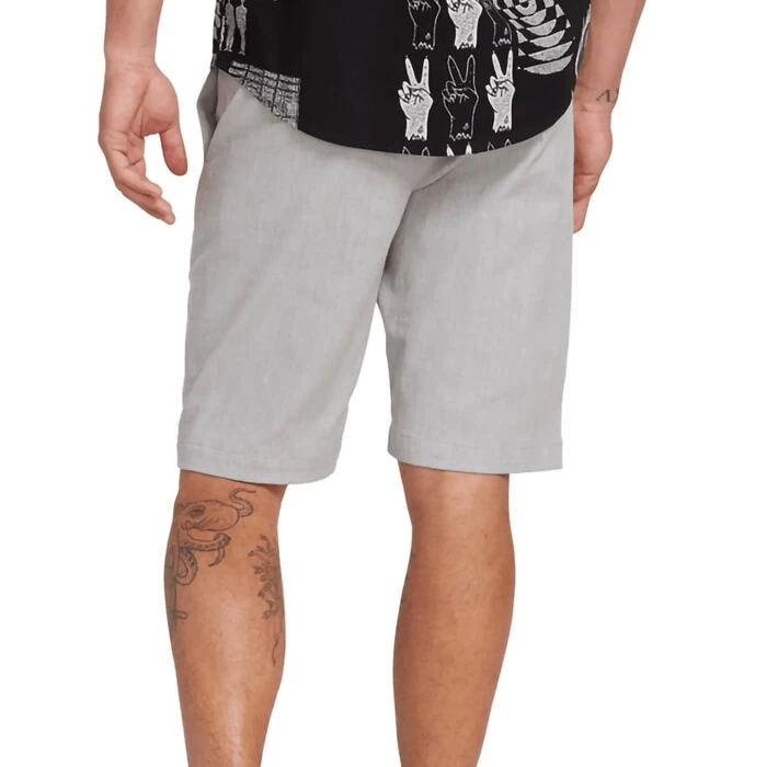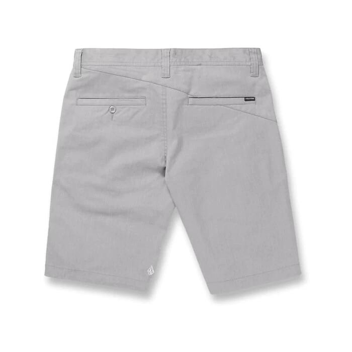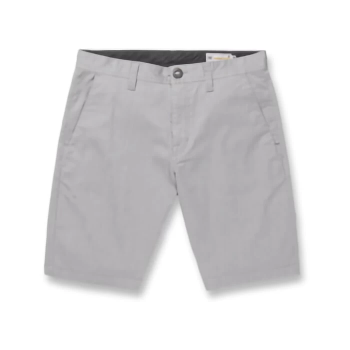 Volcom Frickin Modern Stretch 21″ outseam modern fit shorts in grey features 4 pockets and asymmetric yoke as well as button pocket and zip fly. Branding includes a Volcom embroidered logo and Volcom woven label. Made with recycled fabric. Made from 59% cotton – 39% recycled polyester and 2% elastane.