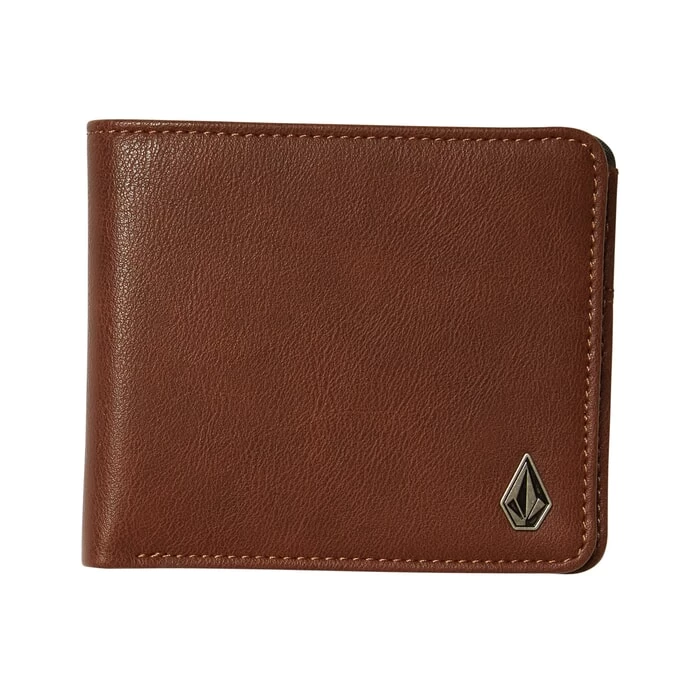 Volcom Slim Stone faux leather wallet in brown features 6 card slots and mesh ID window as well as zip coin pocket. Branding includes a Volcom debossed logo and Volcom metal badge. Made from 100% polyurethane and is 10cm high x 12cm wide x 2cm deep.