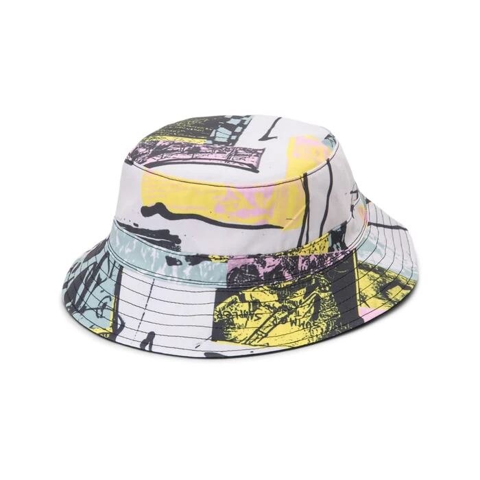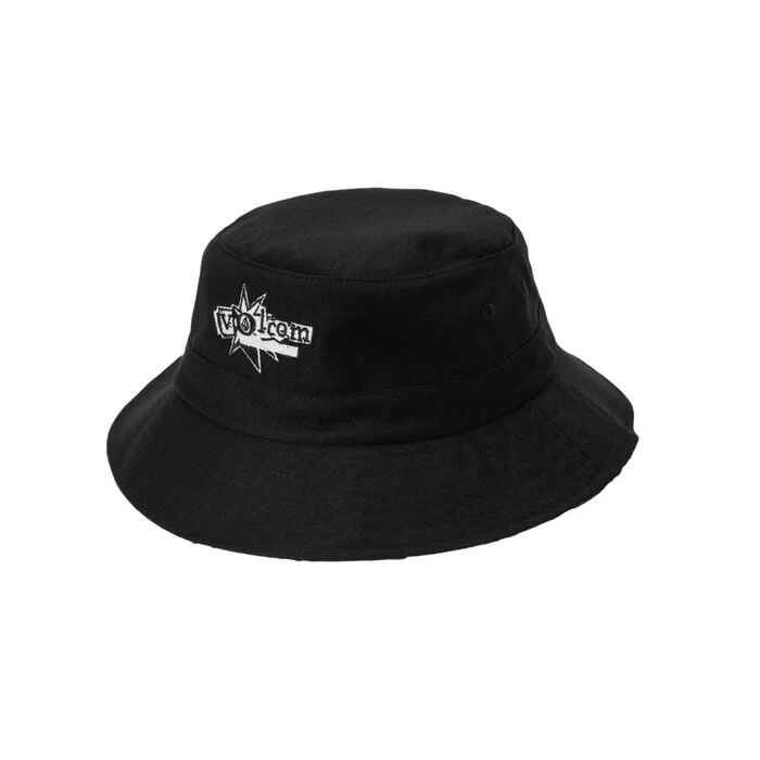 Volcom V Entertainment Flyer bucket hat in black combo features a reversible design and stitched eyelets. Branding includes a Volcom printed logo. Made from 50% cotton and 50% polyester.